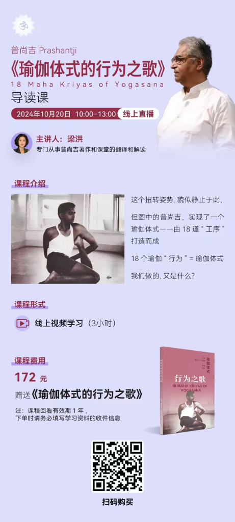 《行为之歌》之前的版本,只尝试出了原著的前4章,那已用了译者的洪荒之力,今天这个全新的完整版本,被译者更名为:《瑜伽体式的行为之歌》它,约等于译者的理解,也被“瑜伽行为”重启,被赐予完成全书的勇气。所以 – 书中“译者的话”说:- 普尚吉自己的课堂和书籍,本就是彼此联结的,这说明,即使是在世俗的环境里,他也充分实践着瑜伽“Union”(联结/联合)的理念;所以导读 + 书籍,也逐渐形成了“联结/联合”的风格。