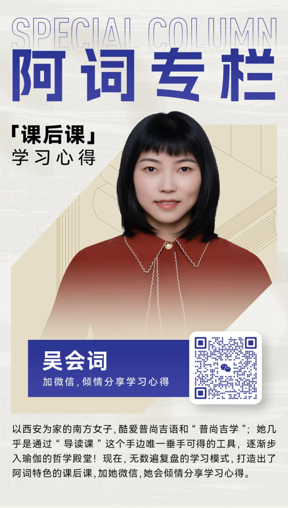 八冊書學習了四冊、受普尚吉《瑜伽教育》後,泛出來的體會是:在現實生活裡,學習八冊書的時候,是我生命出現迄今為止最大波折的時候,這也便成了我學習意願最強的時候因著要解除焦慮。焦慮伴隨我,我是藉著這個危機學會面對它甚或提升自己的生命維度,還是被它拖著向下沉讓生命落入沉降的境地、世俗的糟糕的境地。梁洪老師的課堂珠玉在前,阿詞的課堂對我來說有私人訂做的味道,在這裡我的理解和收穫更直接和明顯,幫助更大。