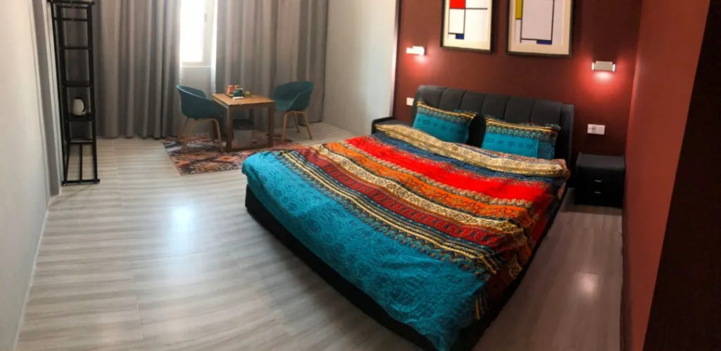 东汐民宿和一般酒店不一样,每层三到四间房,都是一层层出租的,没法接单间房的散客,需要大家组团来。六七个人是小团,租一层;十一二人是中团,租两层;十八九人是大团,租三层。东汐民宿总共三层。