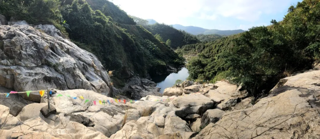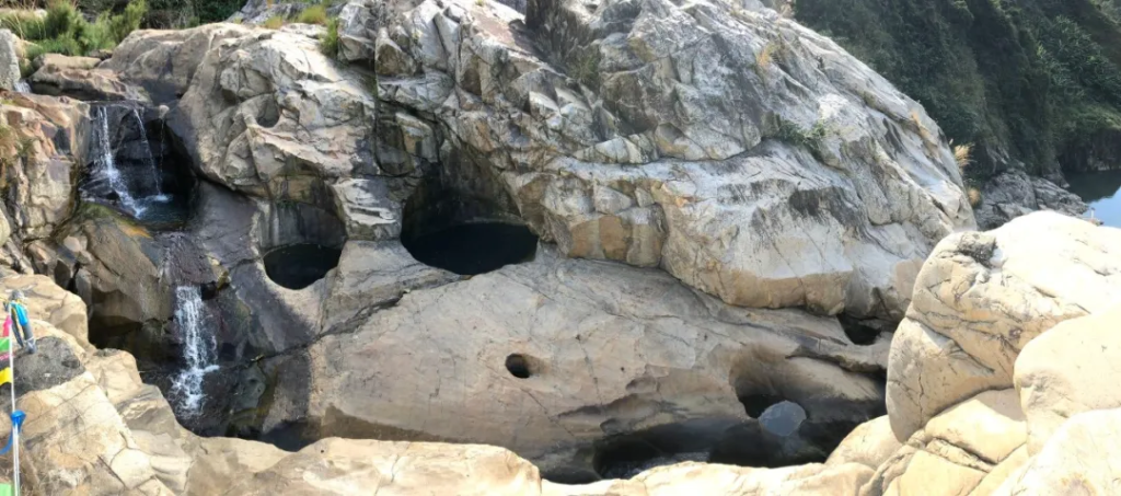 尽头是一挂十米左右高的小瀑布,爬上去能看到巨石上有几个天然圆形石坑,“仙人井”的名称就由此而来。若想再溯流而上,就连小路都没了,一片纯野,安全起见,还是算了吧。