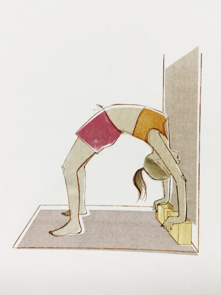 要想保持脊柱充分伸展,不要用蛮力后弯。靠墙放两块砖,双手放在砖上做上弓式,以便专注地打开双肩和胸腔,尽量上提骨盆。