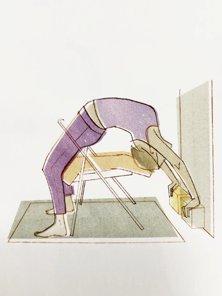 如果你能做深度后弯,推起身体的时候一定要小心。如果不能,躺在抱枕上给背部热身。然后坐在折叠椅上,面向椅背,在脚下的位置靠墙放两块砖。打开胸腔向后躺,顺着椅子向下滑,脚跟落在砖上,伸展双腿。双手拉椅子侧面,令胸腔上提打开。