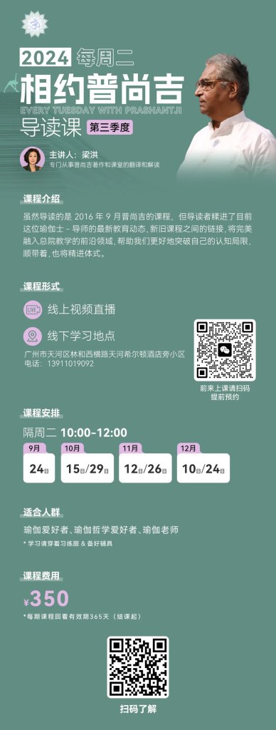 然后,他(Ramadas Swami),又说到:为了达成这种努力,首先要保持纯粹(普尚吉曾宣称自己不是完美主义者,而是纯粹主义者),一定要有虔诚的礼敬仪式,不该有任何的怠慢或敷衍了事,这样的话,即使他/她行走于人间,也不会受到污染;否则,当他/她开始与人群共行时(从瑜伽回到世俗社会),会慢慢失去修来的灵性精髓。……与谁同形、与谁共享,都要小心谨慎地甄选、判别,我们不该浪费精力与无效之人进行沟通,他们不会做出任何贡献,因为他们既不接受这类教育,甚至都不愿真正地参与、吸收,更不去分享所得到的一切、传播听到的智慧之声。所以,要虔诚/真诚对待那些追寻灵性智慧的人,务必做到只去“游说”那些对至高哲学智慧有偏爱的人,不要去接近不喜爱这类智慧的人。—————————————— 这番智者名言,教育的那个学生,就包括普尚吉课堂录音的“导读者”!过往近三年,普尚吉的“导读课”(2013年、2014年、2016年普尚吉课堂录音的导读),一直在规律地继续着;今年(2024年)的最后一季,即将开始(请留意海报上的具体时间,下周二的中秋节假日,本该是每个月隔周二的导读课时间,但我们不得不放假停课),很快又将结束。这几年导读者的经历和感受,印证了智者这番教诲的背后起因,她由此感叹:甚至连时间,都不等无缘之人;即使是普尚吉,也喊不醒装睡之人(yogaaaa/身体文化的拥趸);所以,导读者学会了将自己有限的关注点、放在有心学习真正瑜伽的同学(Students of Yog)身上,他们和导读者一样,没有在意最初的、或一时的“听不懂”,“听不懂”是我们自己的问题,不是普尚吉的错。 因为,只要我们谦卑地打开自己的耳朵、虔诚地敞开自己的心灵,“智慧之声、吉祥之语”自然会在适当的时间、进入我们的意识深处、悄然地改变我们。